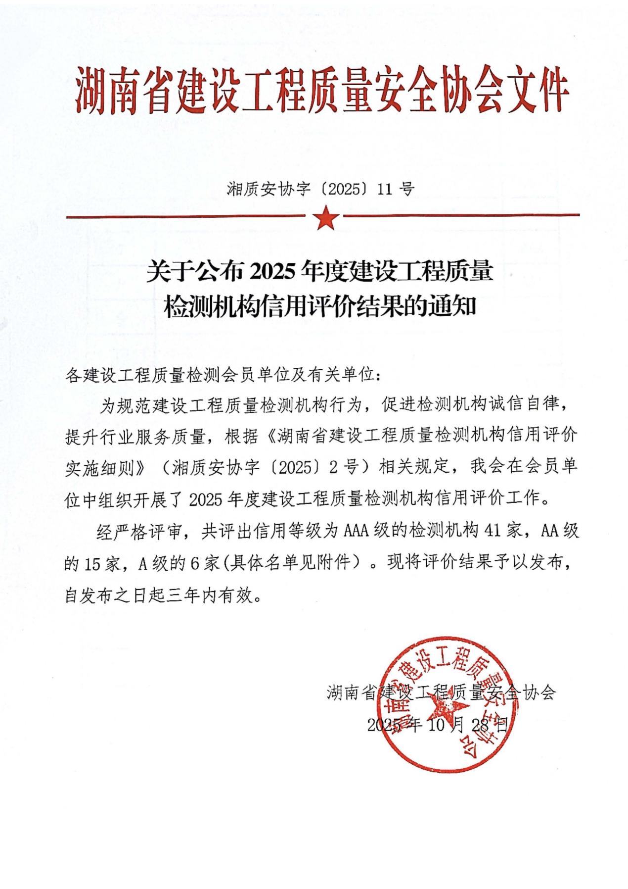 喜报|工勘院有限公司荣获湖南省2025年度建设工程质量检测机构信用AAA等级评价