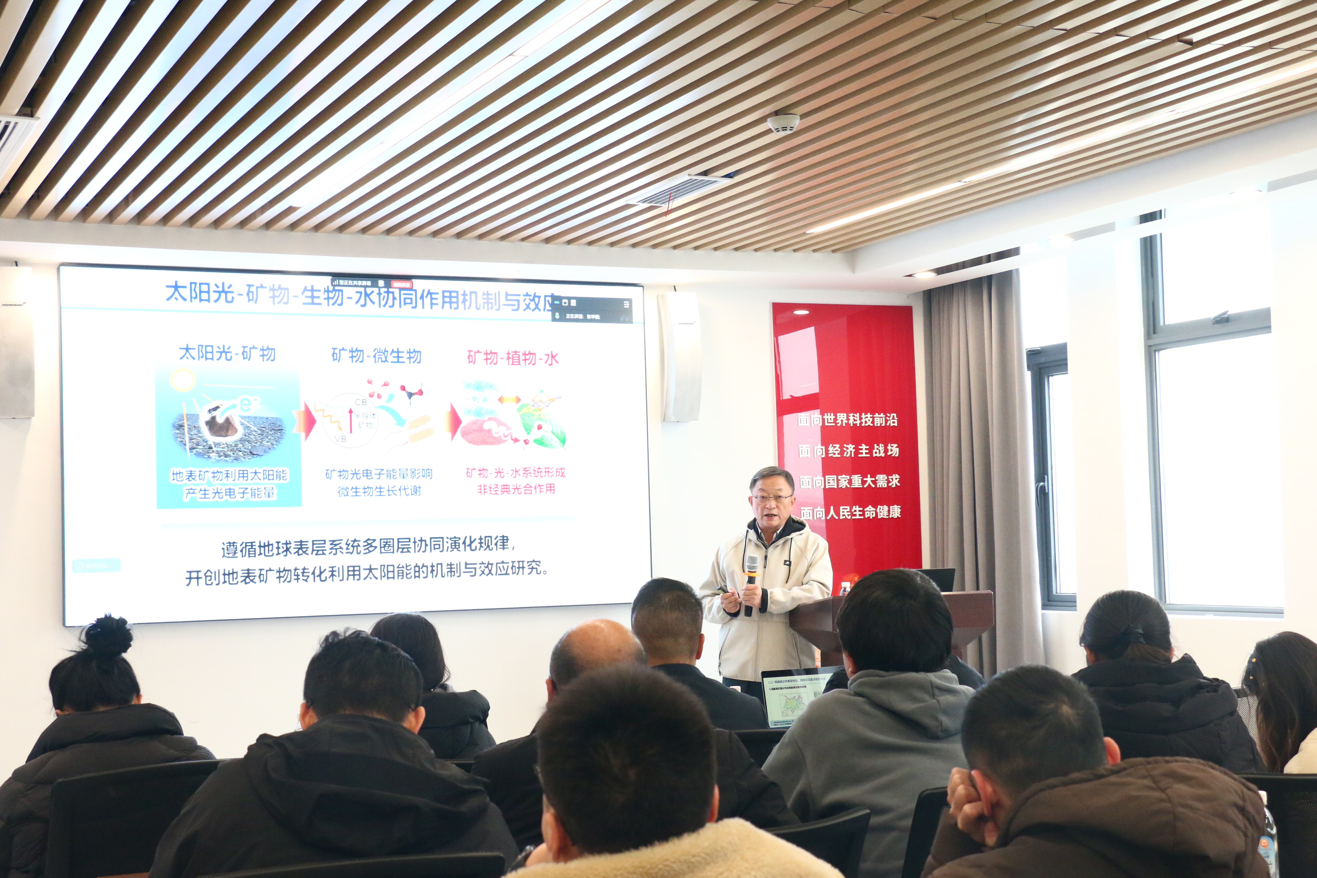 鲁安怀教授以“水稻增产提质与稻田镉污染防治新技术应用—矿物促进植物半人工光合作用机制与效应”为主题,从微生物半人工光合作用与植物光合作用的新认知切入,重点阐释了地表矿物如何通过转化利用太阳实现非经典的植物光合作用光反应裂解水的过程,提出从水资源、水质量到水功能研究新阶段,揭示了地球系统中“太阳光-矿物-水-生物”之间耦合作用机制。