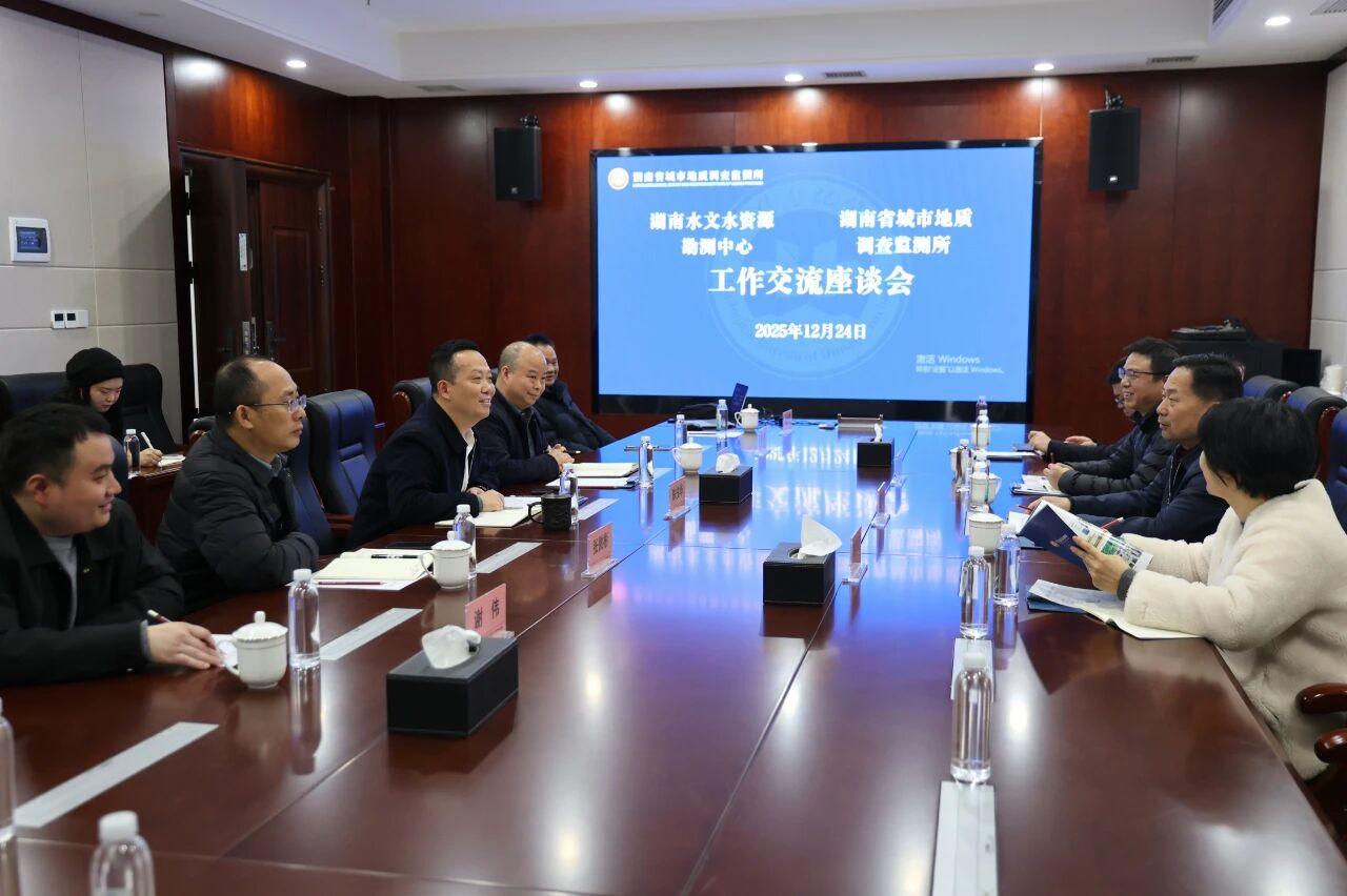 12月24日,湖南省水文水资源勘测中心主任王炎荣率队到湖南省地质院城调所座谈交流,双方围绕深化“优势互补、长效协作”机制深入研讨。湖南省水文水资源勘测中心副主任刘利明、湖南省地质院城调所所长陈俊华、副所长向华参加,共绘水文地质融合发展新蓝图。
