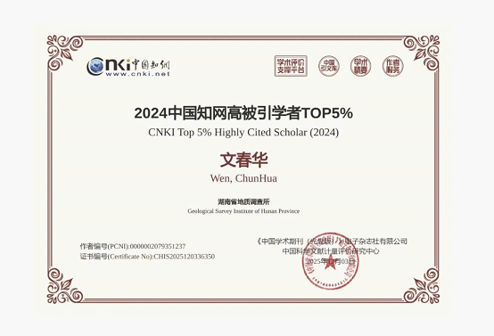 省地质院地调所柏道远、文春华入选2025中国知网高被引学者TOP5%