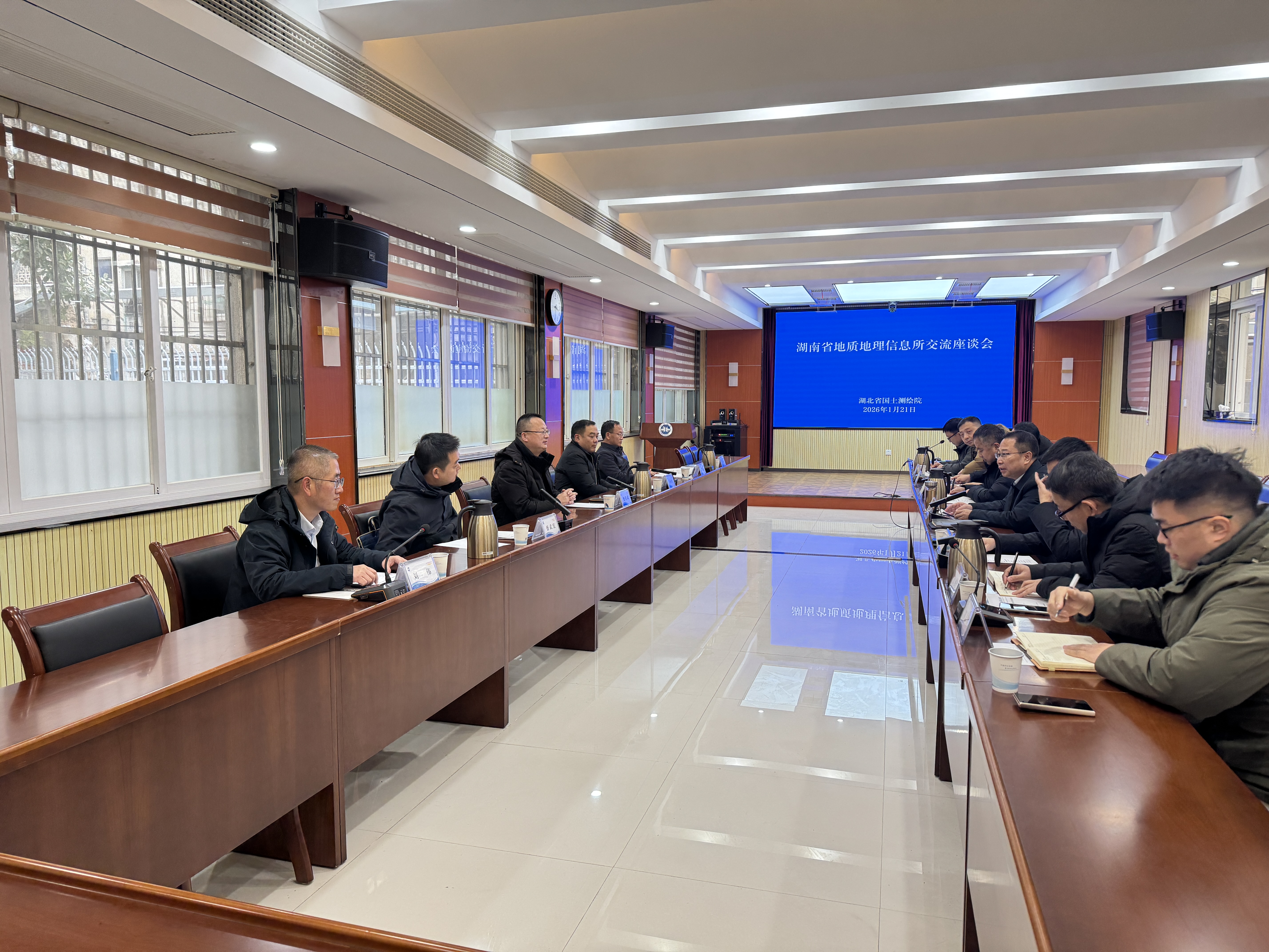 1月21日,湖南省地质院地信所所长樊任武一行到湖北省国土测绘院开展座谈交流,双方围绕项目管理、转型发展、技术创新三大核心议题共话行业发展。湖北省国土测绘院院长谭文专参加并主持座谈。