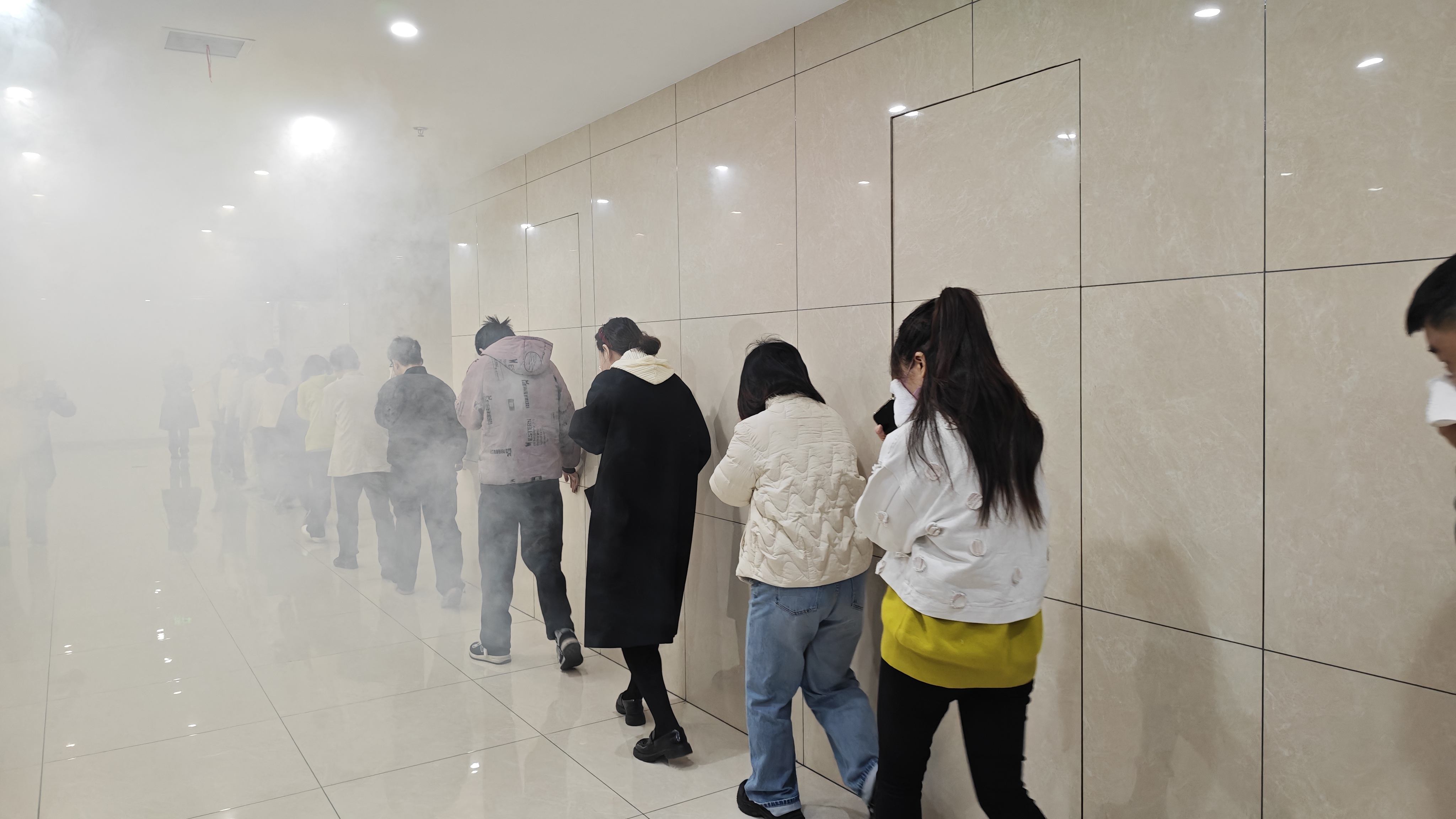 演习在急促的消防警报声中拉开帷幕。模拟火灾场景触发后,全体职工反应迅速,在现场工作人员的指引下,严格按照逃生规范,用湿毛巾捂住口鼻、弯腰低姿,沿安全通道迅速撤离。整个疏散过程秩序井然,全员仅用时3分钟便安全抵达一楼指定集结区,高效完成了逃生演练。