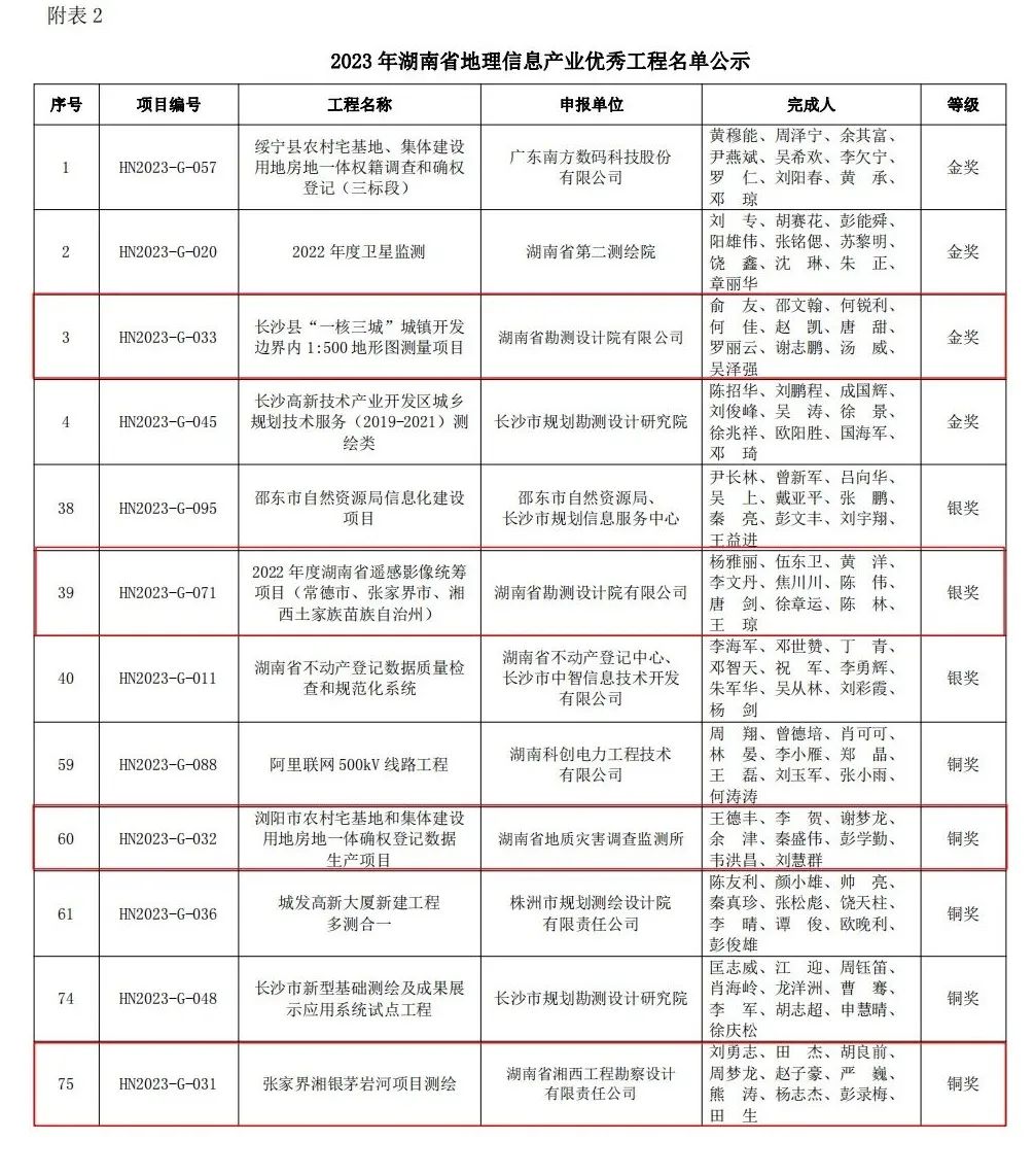近日,从湖南省地理信息产业协会与测绘地理信息学会传来喜讯,省地灾所所属企业湖南省勘测设计院有限公司、湖南省城乡建设勘测院有限公司、湖南省湘西工程勘察设计有限责任公司斩获湖南省地理信息产业优秀工程4项,湖南省优秀测绘工程奖4项,其中湖南省勘测设计院有限公司荣获2023年湖南省地理信息产业“十佳单位”。