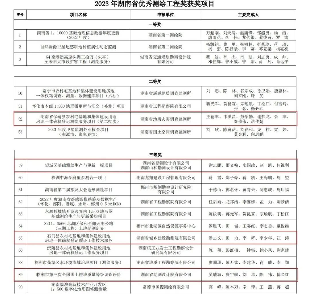 在湖南省优秀测绘工程奖项中,承担的“湖南省保靖县农村宅基地和集体建设用地房地一体确权登记测绘服务项目(第二批次)”荣获二等奖,“望城区基础测绘生产与更新一标项目”“石门县农村宅基地和集体建设用地房地一体确权登记颁证工作技术服务”“临湘市第三次全国国土耕地质量等级调查评价”分别荣获三等奖。这些项目助力摸清耕地质量家底,满足国土空间规划、城市建设管理等业务的工作底图需求,为助推农业绿色发展,高效服务全省经济社会高质量发展贡献了力量。