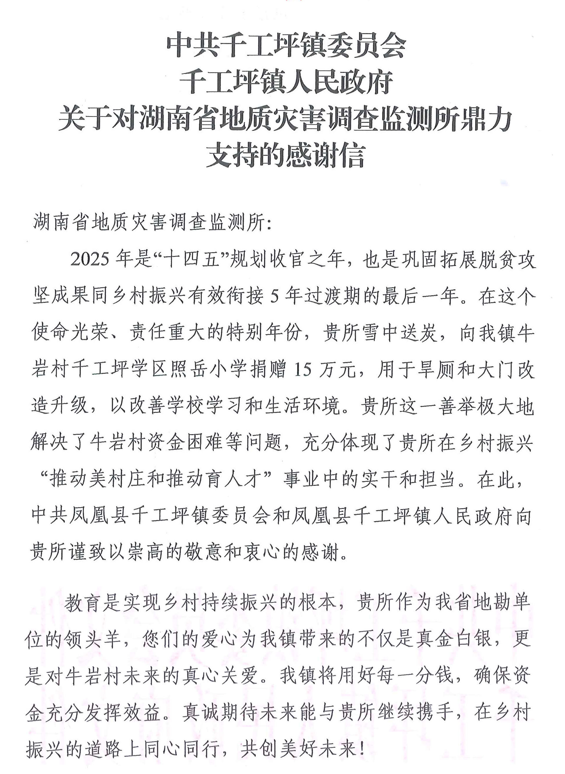 7月27日,湖南省地质院地灾所收到中共凤凰县千工坪镇委员会和凤凰县千工坪镇人民政府写来的感谢信,感谢该所向凤凰县千工坪镇牛岩村照岳小学捐赠15万元专项改造资金,升级校园基础设施、优化师生学习生活环境,为该所助力乡村全面振兴的务实作为点赞。