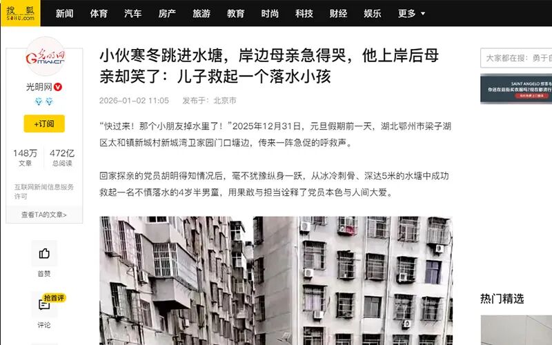 2026年1月2日 搜狐网 《小伙寒冬跳进水塘,岸边母亲急得哭,他上岸后母亲却笑了:儿子救起一个落水小孩》