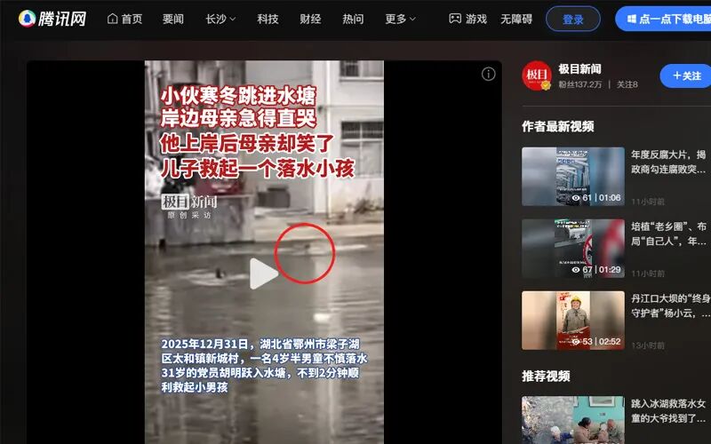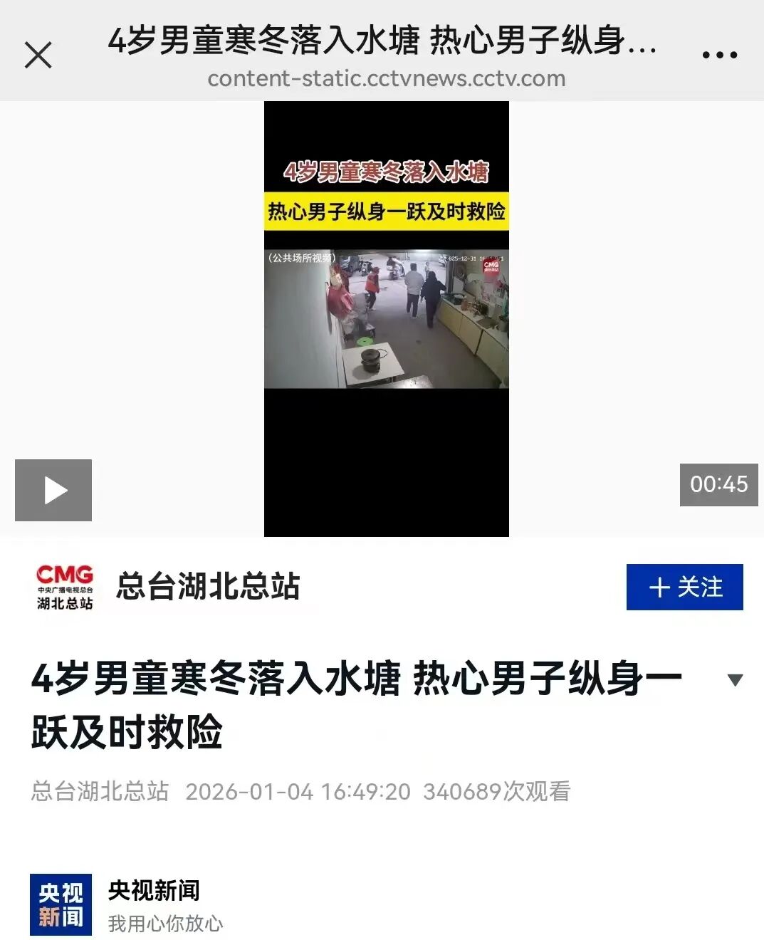 2026年1月2日 极目新闻《小伙寒冬跳进水塘,岸边母亲急得哭,他上岸后母亲却笑了:儿子救起一个落水小孩》