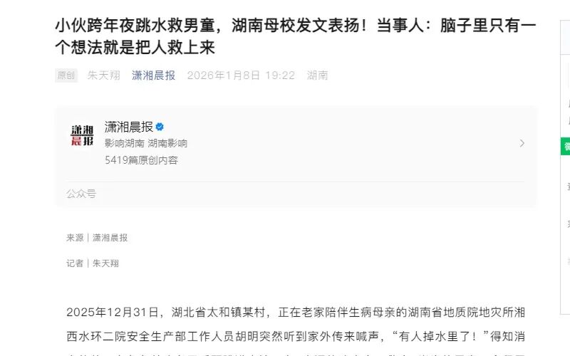 2026年1月8日 潇湘晨报《小伙跨年夜跳水救男童,湖南母校发文表扬!当事人:脑子里只有一个想法就是把人救上来》