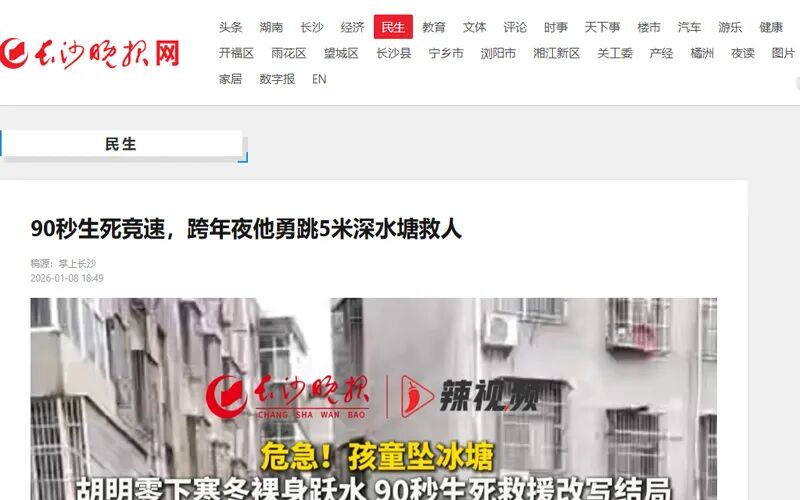 2026年1月8日 长沙晚报网 《90秒生死竞速,跨年夜他勇跳5米深水塘救人》