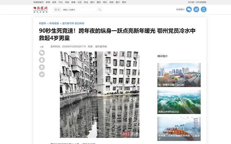 2026年1月5日 荆楚网《90秒生死竞速!跨年夜的纵身一跃点亮新年暖光 鄂州党员冷水中救起4岁男童》