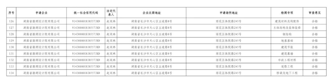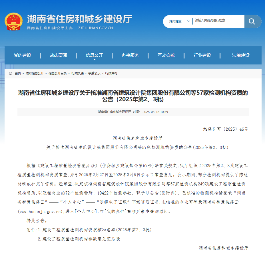 3月18日,从湖南省住房和城乡建设厅门户网站传来喜讯,湖南省地质灾害调查监测所所属企业湖南省勘测设计院有限公司成功通过了建设工程质量检测机构的九大专项资质认证,标志着其在湖南省建筑检测市场中的竞争优势和品牌影响力得到进一步增强,也为后续申报建设工程质量检测机构综合资质认证奠定了坚实基础。