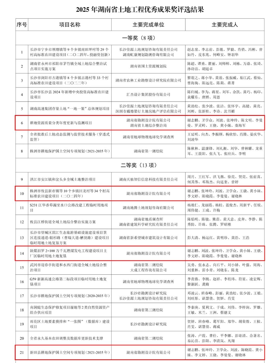 10月28日,湖南省土地学会公布2025年湖南省土地工程优秀成果奖评选结果,湖南省地质院地灾所下属省勘测设计院有限公司申报的四项成果分别荣获一等奖和二等奖。一等奖--“耕地资源质量分类年度更新与监测项目”该项目是省勘测院积极配合省土地综合整治局规范高效开展的重点工程,涵盖全省122个县(市、区)耕地资源质量分类年度更... .....