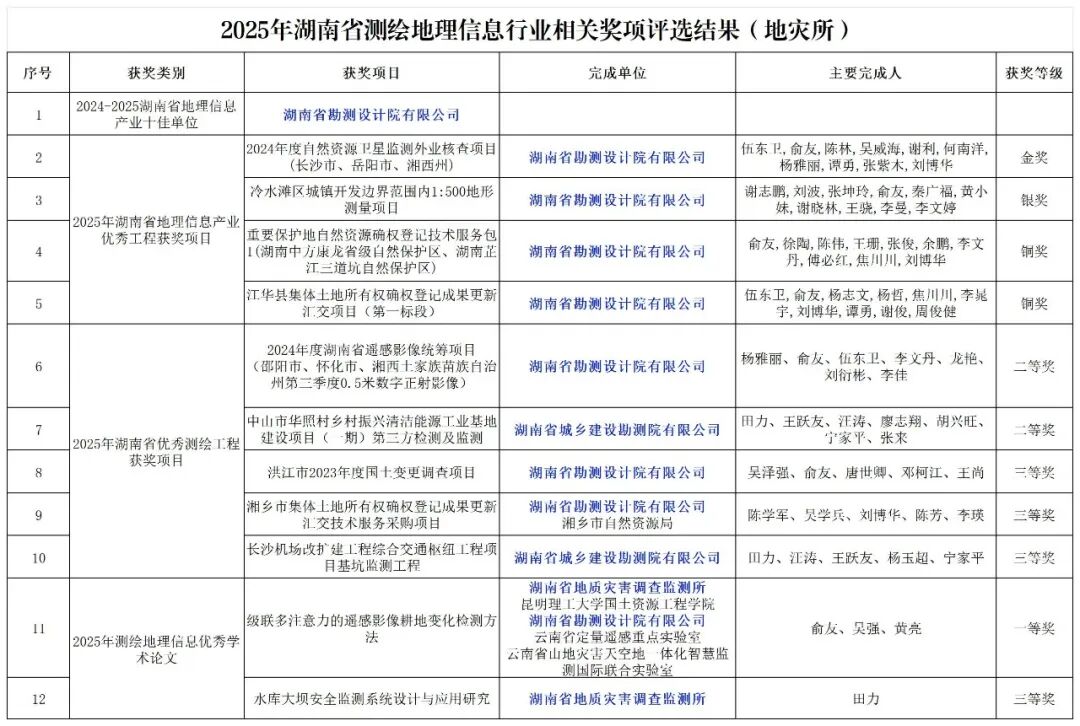 近日,湖南省地质院地灾所和所属企业湖南省勘测设计院有限公司、湖南省城乡建设勘测院有限公司在2025年湖南省测绘地理信息行业系列奖项评选中喜获佳绩,共荣获12项奖项和荣誉。其中,优秀工程金奖1项、银奖(二等奖)3项、铜奖(三等奖)5项,优秀学术论文一等奖和三等奖各1项,省勘院获评2024-2025湖南省地理信息产业十佳单位。此次... .....