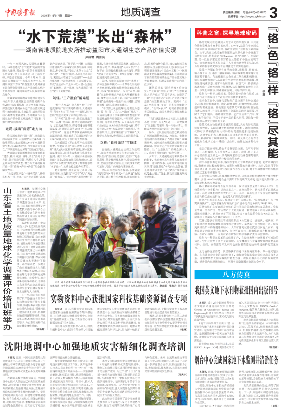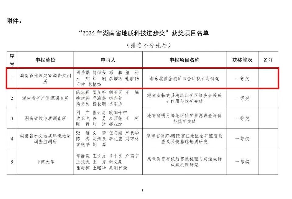 11月12日,湖南省地质学会2025年湖南省地质科技类奖项评选结果揭晓,省地质院所属省地质灾害调查监测所再创佳绩:两个项目分获“湖南省地质科技进步奖”一等奖、二等奖,巫政卿、邹侨获“湖南省青年地质科技奖”,实现项目与个人奖项“双丰收”。这份成绩的背后,不仅体现了地灾所在地质科研领域的创新实力与人才培养成效,还为全所... .....