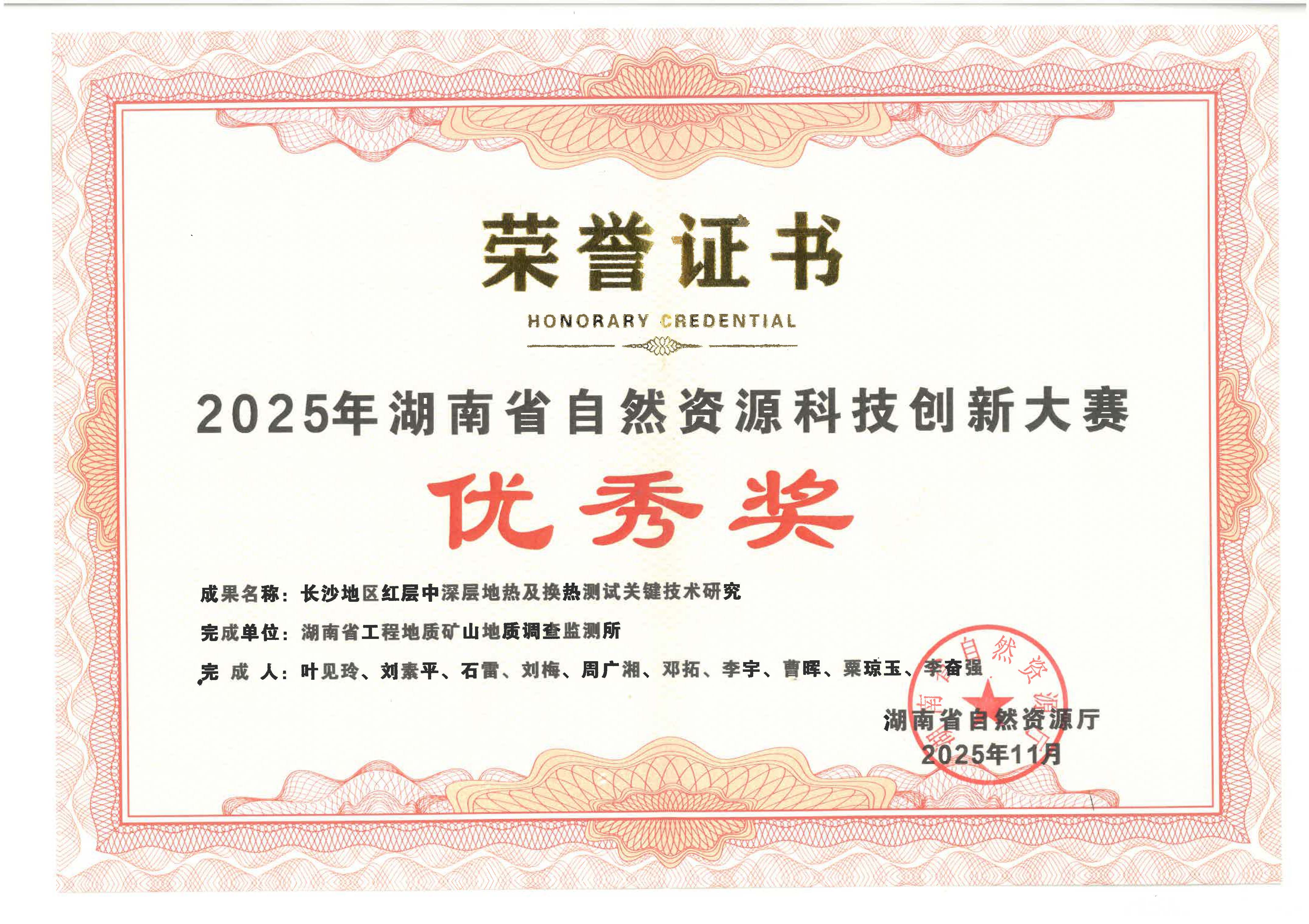 近日,由湖南省自然资源厅主办的2025年度科技创新大赛结果揭晓,工矿所申报的《长沙地区红层中深层地热及换热测试关键技术研究》项目荣获优秀奖。