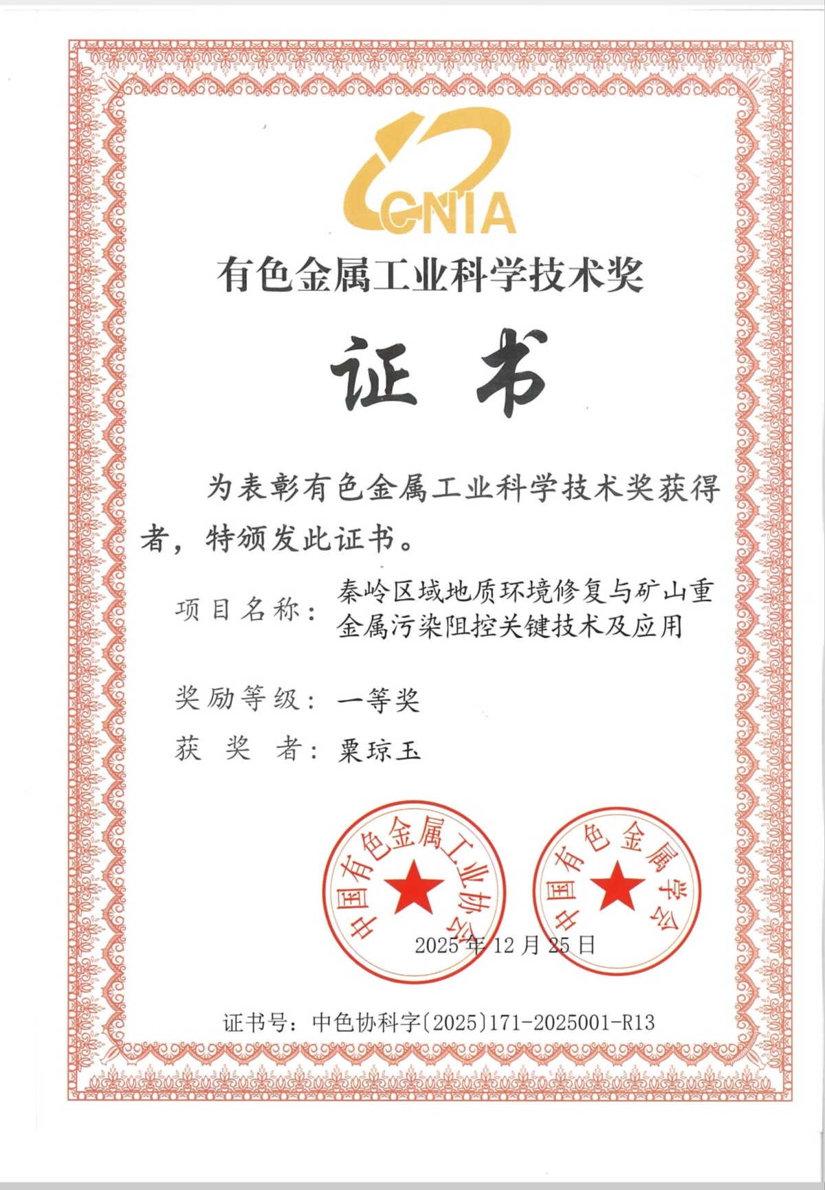 一等奖!湖南省地质院工矿所荣获2025年度中国有色金属工业科学技术奖