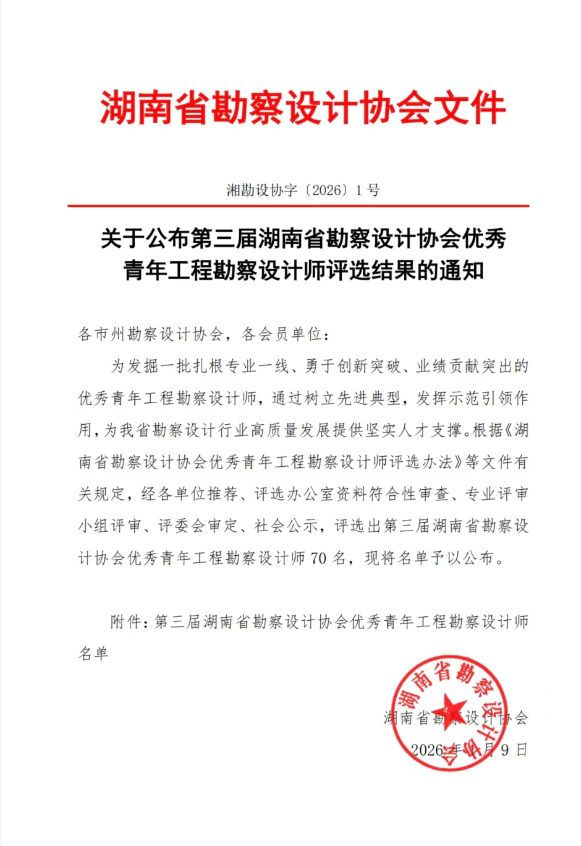 近日,湖南省勘察设计协会正式公布第三届“优秀青年工程勘察设计师”评选结果。湖南省地质院工矿所常宝同志凭借扎实的技术功底和丰富的工程实践经验,成功获评该荣誉称号。