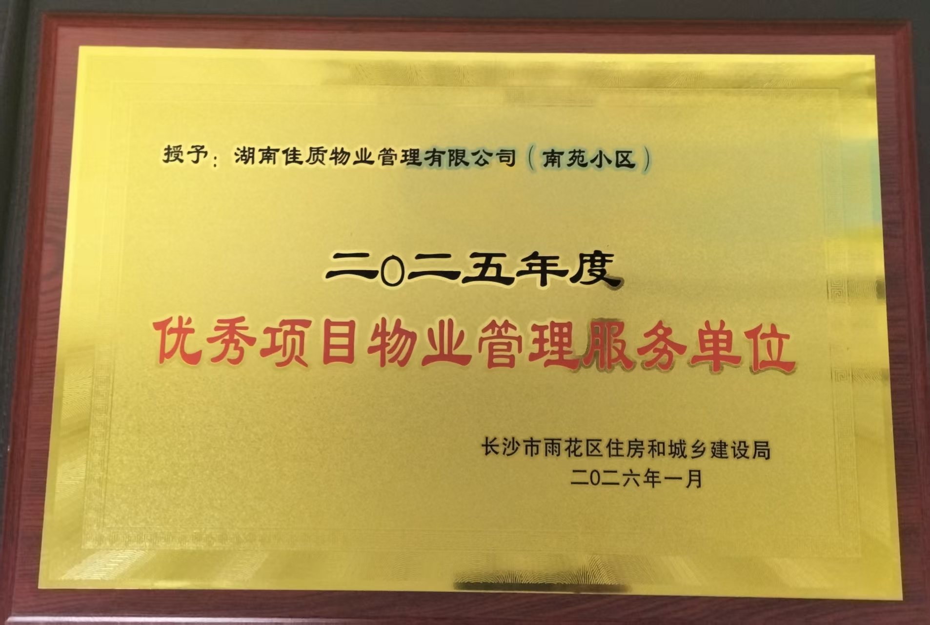 近日,湖南省地质院工矿所下属湖南佳质物业管理有限公司(下称“佳质物业”)凭借卓越的服务品质,荣获雨花区住房和城乡建设局颁发的2025年度“优秀项目物业管理服务单位”称号。