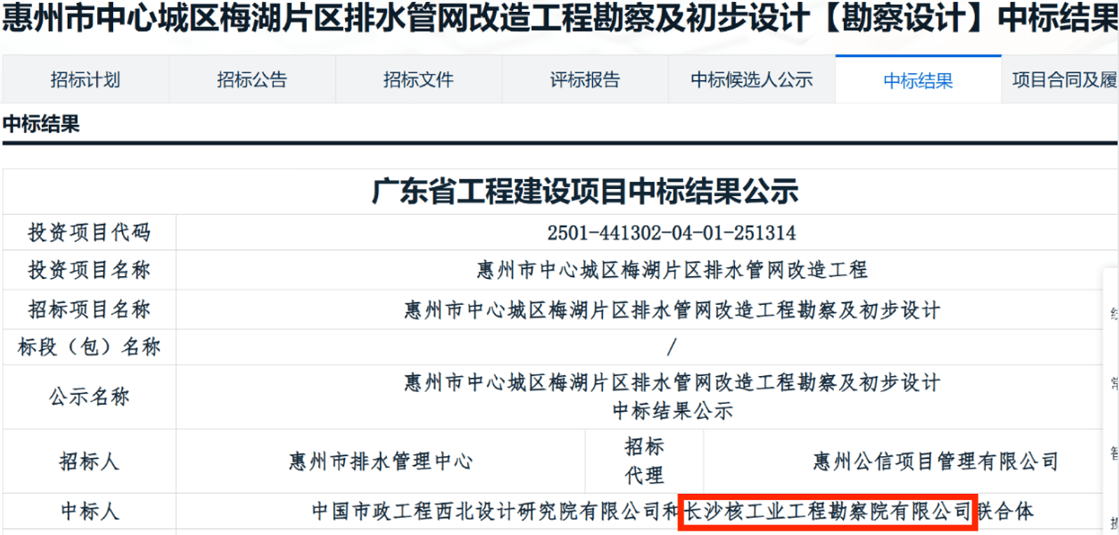 近日,省地质院核地质所长沙核工业工程勘察院有限公司与中国市政工程西北设计研究院有限公司组建联合体,成功中标“惠州市中心城区梅湖片区排水管网改造工程勘察及初步设计”项目,中标金额约1285万元。
