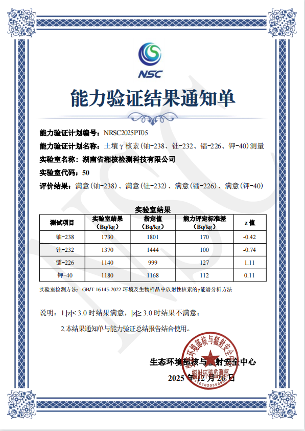 此外,中心在生态环境部核与辐射安全中心组织的2025年度辐射监测能力验证中,同样取得优异成绩。验证重点考核了水中总α、总β放射性活度浓度,以及土壤中γ核素(铀-238、钍-232、镭-226、钾-40)的分析能力,所有项目均获“满意”评价,充分展现了中心在承担国家辐射环境监测任务、支撑地方生态环境保护方面的技术可靠性。