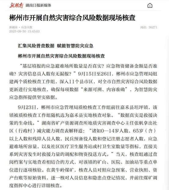2025年9月,郴州市应急管理局组织质检核查工作组分别深入11个县市区,通过测量、问询、查阅资料等方式,对全市乡镇(街道)、社区(行政村)、化工园区、企业、加油加气加氢站、煤矿(非煤矿山)、公共服务设施等七大类重点调查对象共计5935条调查数据,按10%的抽查比例进行实地核查、逐项核验,坚决推行数据核查全覆盖,构建起“县级自检—市级质检—整改复核”的闭环管理体系,为智慧防灾应急指挥提供坚实依据打造了“郴州样板”。