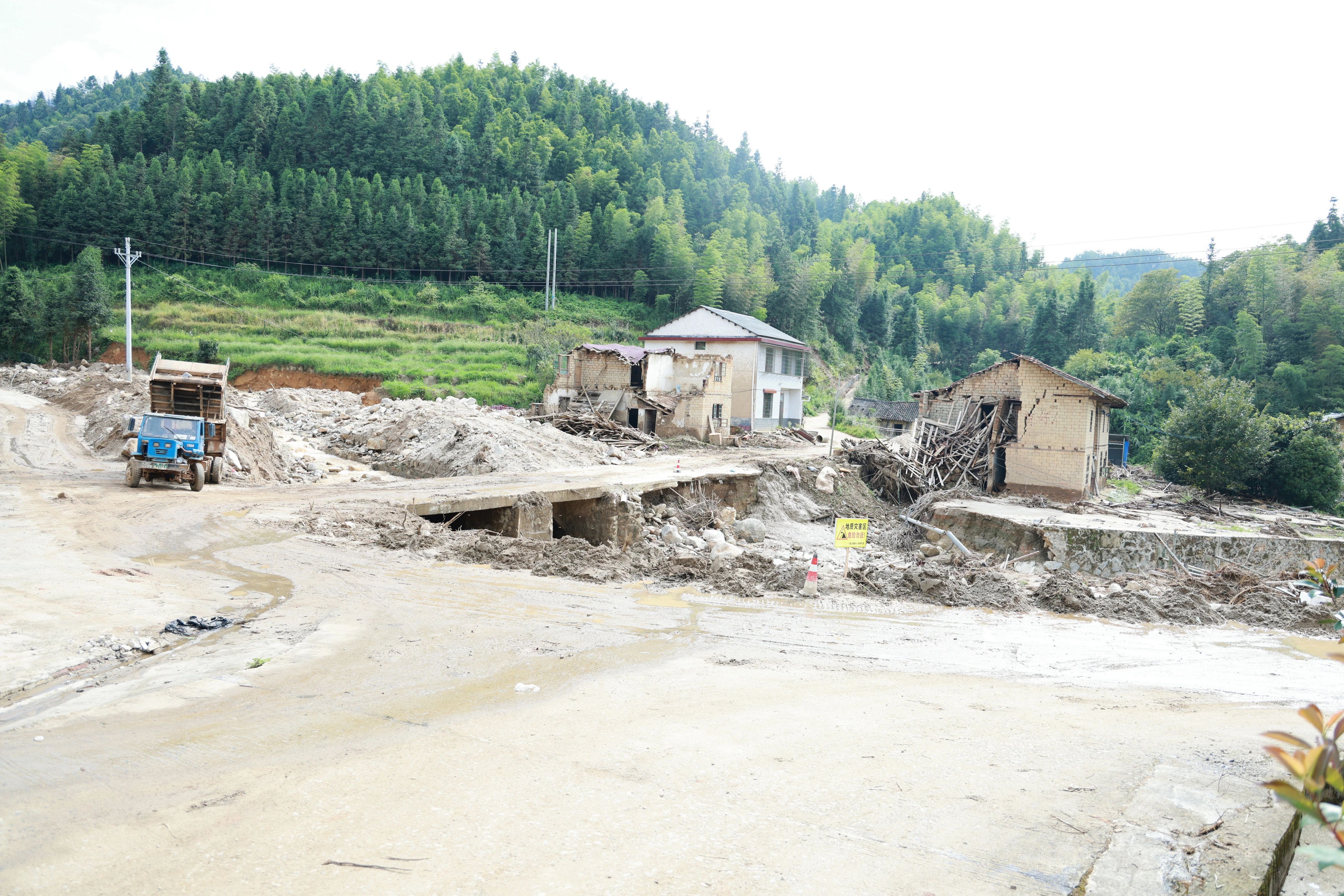 谁能想到,一年多前的大雁山村还是一片满目疮痍的景象。2024年7月27日,台风 “格美” 强势肆虐湘南大地,大雁山村遭遇历史罕见的特大洪灾:山体滑坡、民房倒塌、桥梁断裂,主干道路基被洪水掏空大半,多处边坡高陡松动,车辆寸步难行,全村直接经济损失超6000万元。灾情就是命令,责任重于泰山。省地质院闻汛而动、火速响应,第一时间派出驻村工作队进驻灾区,在残垣断壁之间正式拉开重建攻坚的序幕。