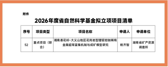 近日,湖南省科学技术厅公示2026年度省自然科学基金拟立项项目名单。由湖南省地质院矿调所牵头申报的“湘南香花岭-大义山地区花岗岩型锂铌钽铷稀有金属超常富集机制与成矿模型研究”项目成功通过立项,项目类型为重点项目(联合)。这是省矿调所首次作为牵头单位获得该类重点项目立项,实现了省自科基金重点项目零的突破。