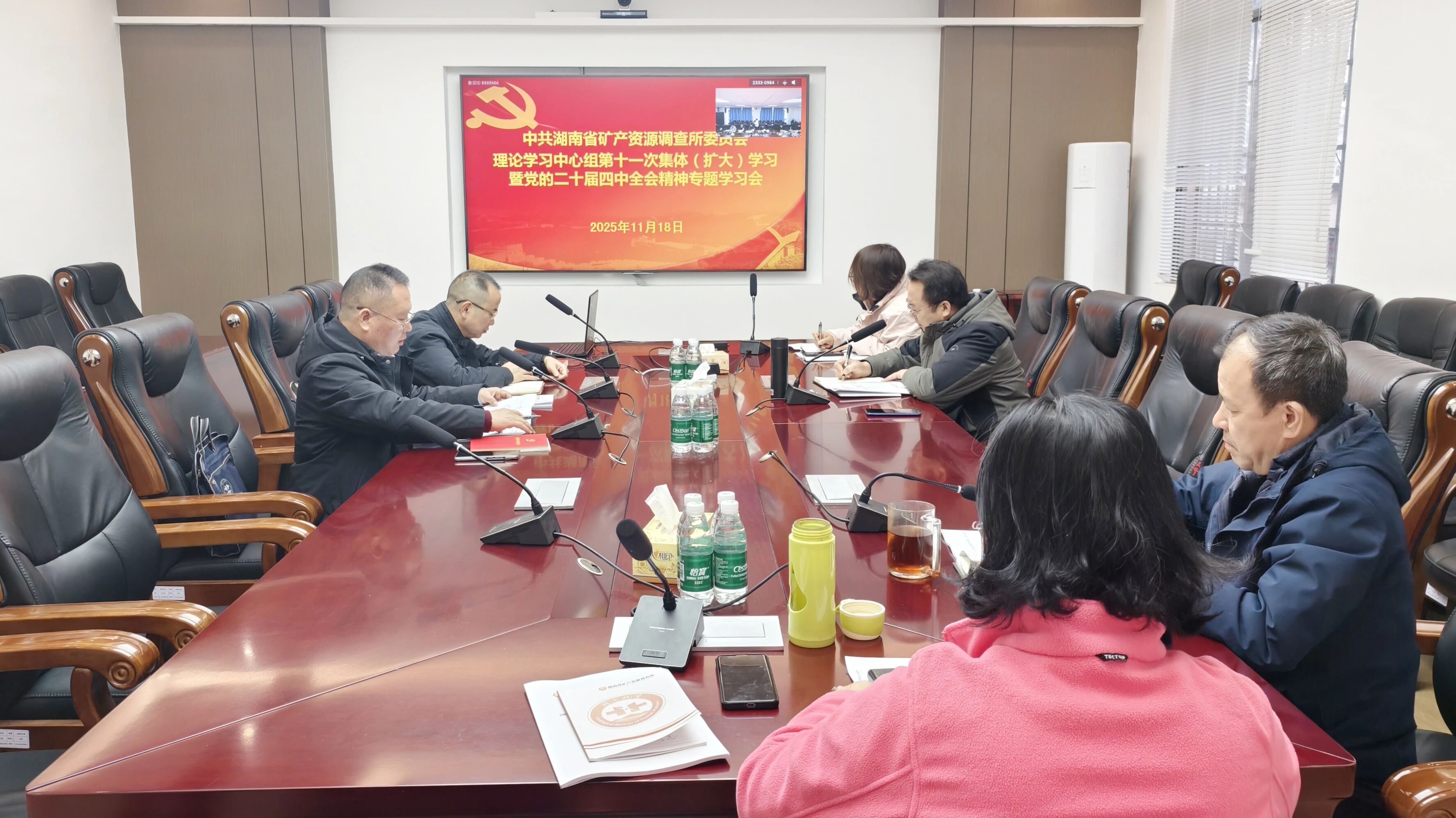 11月18日,湖南省地质院矿调所党委召开理论学习中心组2025年第11次集体(扩大)会,专题学习党的二十届四中全会精神。会议由党委书记陈学军主持,班子成员、在职院管干部,相关职能部门负责人及青年代表参加。