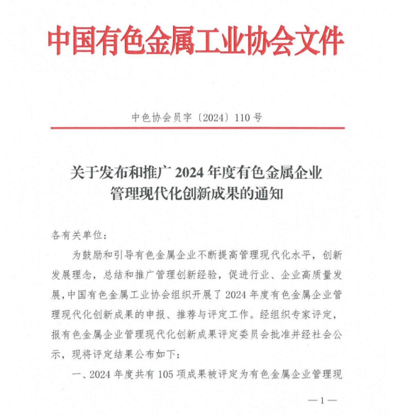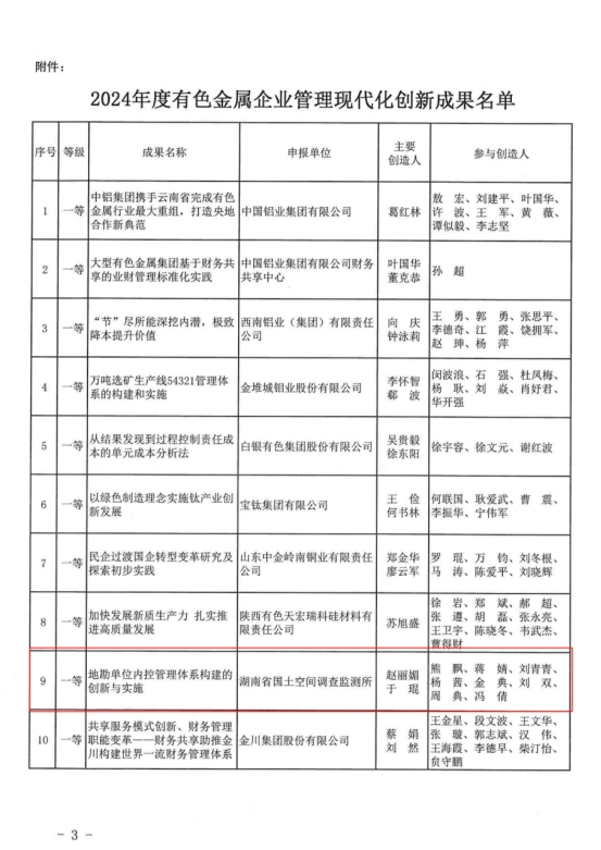 近日,中国有色金属工业协会发布2024年度有色金属企业管理现代化创新成果名单。省空间所申报的《地勘单位内控管理体系构建的创新与实施》成果荣获一等奖。