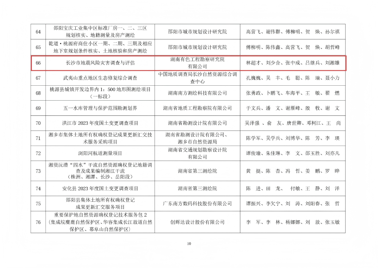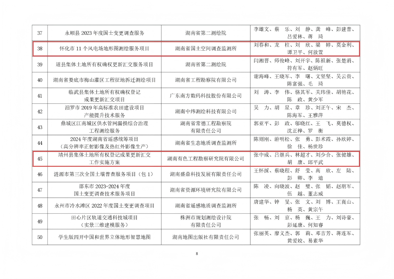 其中,空间所《怀化市11个风电场地形图测绘服务项目》荣获二等奖,所属企业湖南有色工程勘察研究院有限公司《靖州县集体土地所有权登记成果更新汇交工作实施方案》荣获二等奖、《长沙市地震风险灾害调查与评估》荣获三等奖。