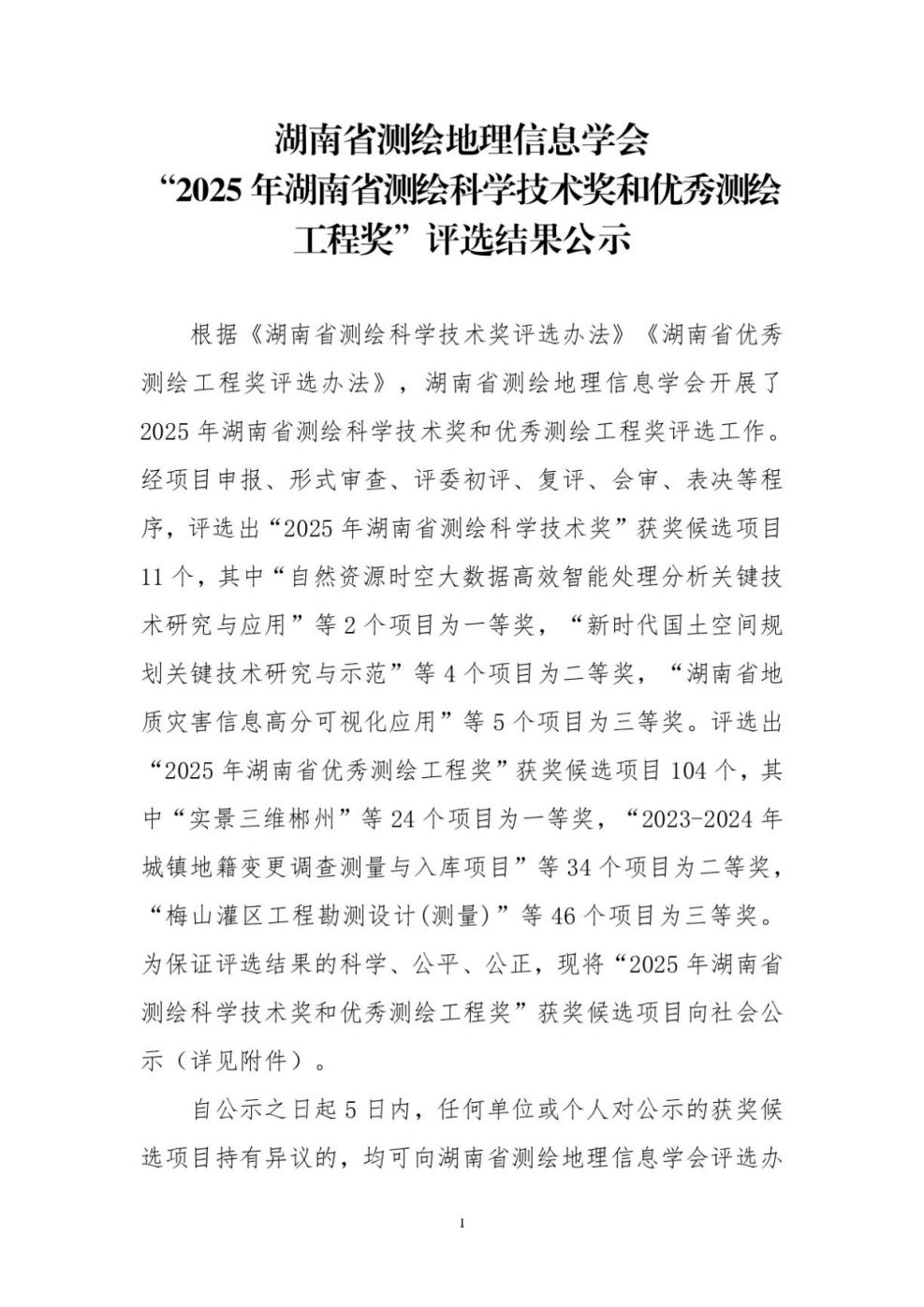 近日,湖南省测绘地理信息学会公布了“2025年湖南省测绘科学技术奖和优秀测绘工程奖”评选结果,湖南省地质院空间所在此次评选中收获颇丰,斩获优秀测绘工程奖二等奖2项,三等奖1项。