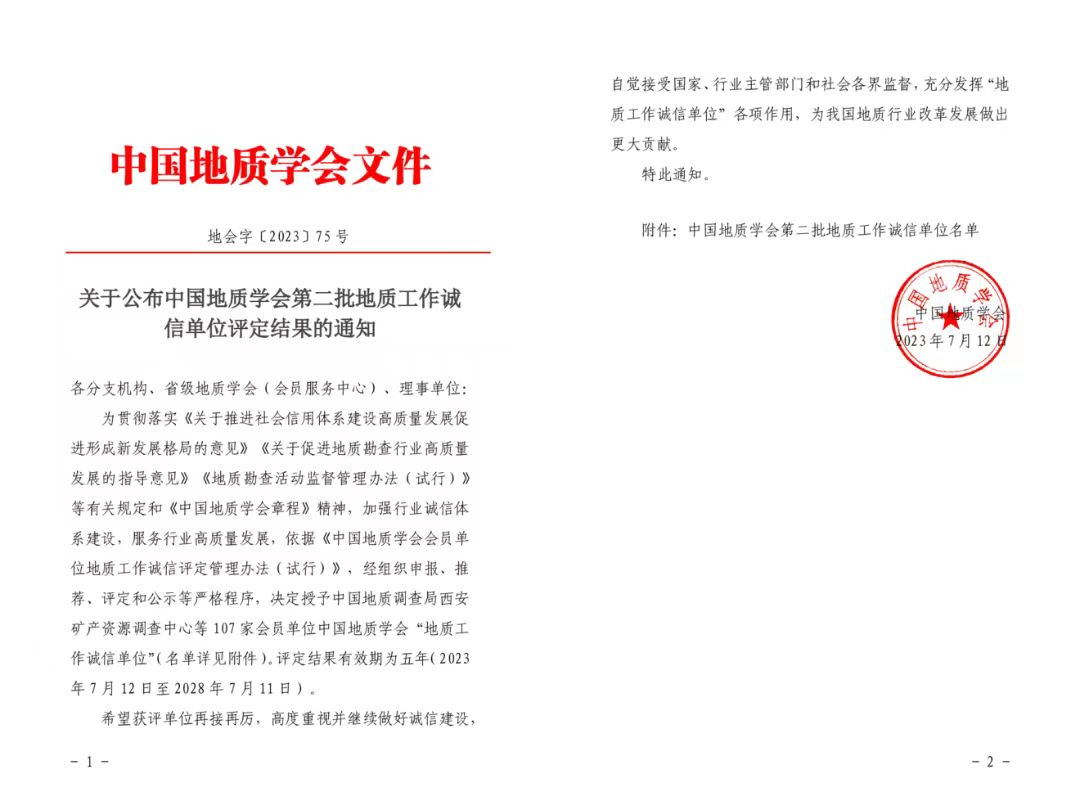 7月12日,中国地质学会公布第二批地质工作诚信单位评定结果,决定授予107家会员单位为中国地质学会“地质工作诚信单位”,省水环所入选此次诚信单位名单。
