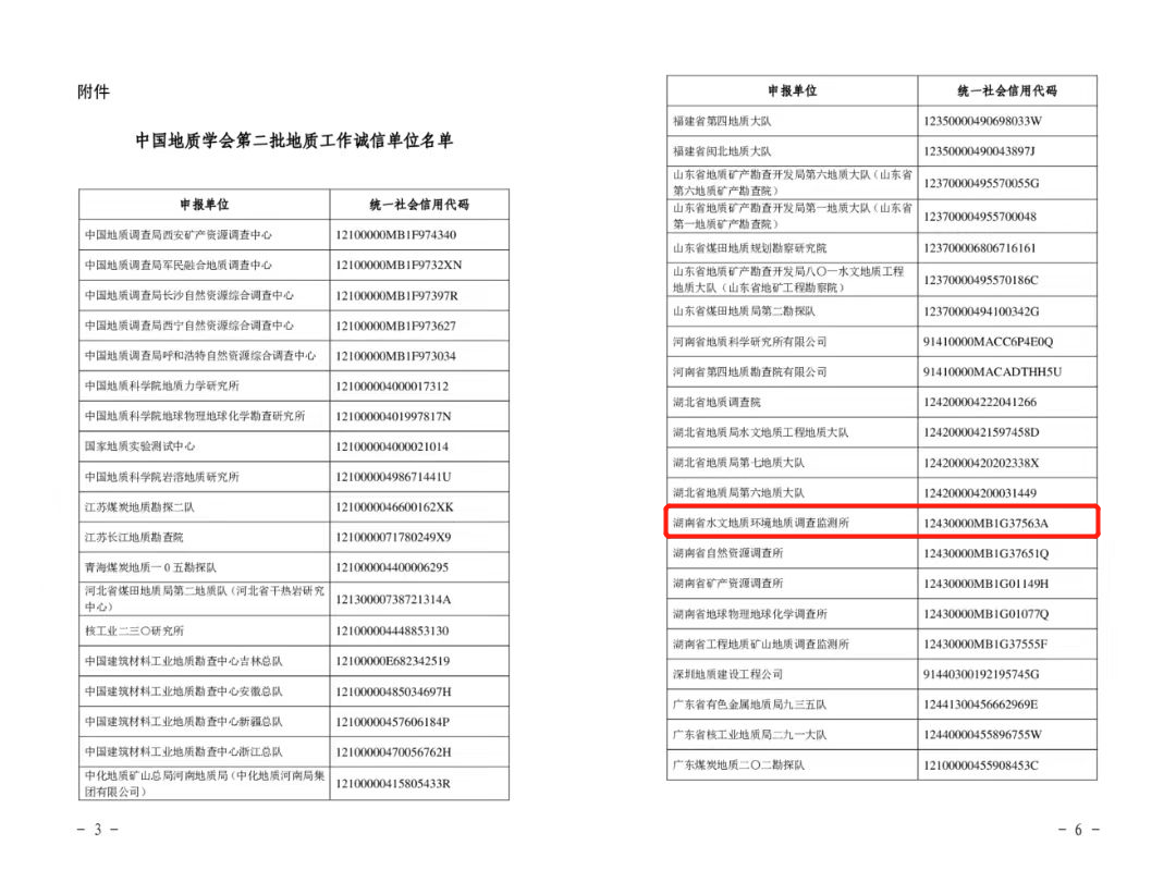 为服务地质行业改革发展,加强地质行业诚信体系建设,中国地质学会于今年3月启动开展会员单位地质工作诚信单位评定(第二批)工作。收到申报推荐通知后,省水环所领导高度重视,精心安排部署申报工作,由所总工办牵头,资源中心、水文中心、合同管理部门、财务管理部门等相关部室和二级单位积极配合,高质量完成了相关申报工作,经湖南省地质学会严格审核与推荐、中国地质学会审查评定和公示,省水环所成功入选,有效期为五年。