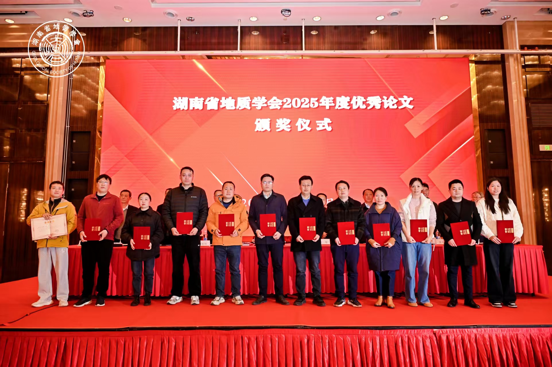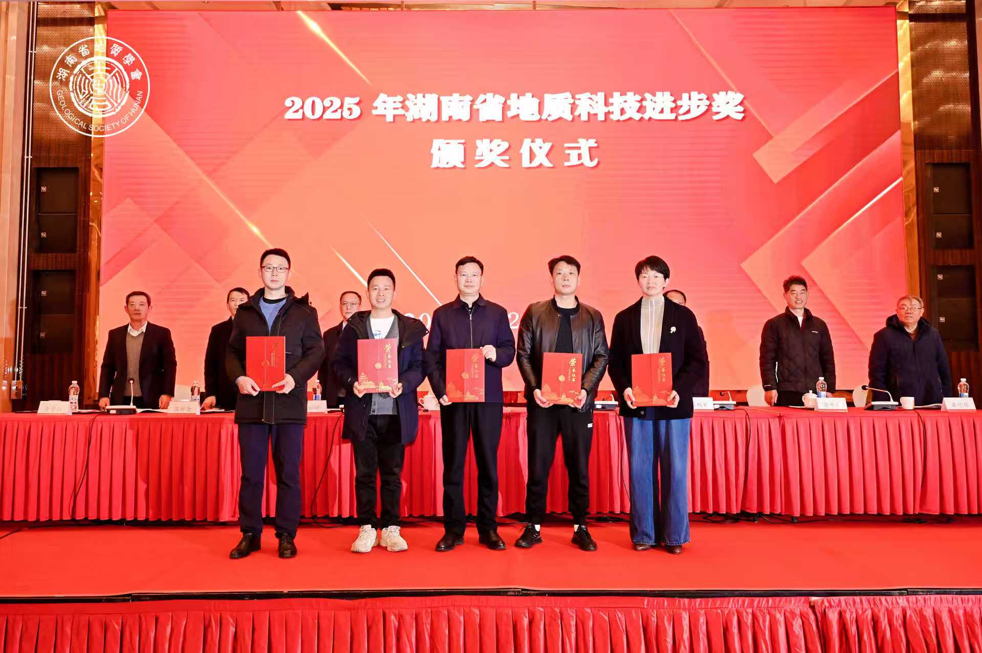 会上,由水环所承担实施的《湖南省浏阳-醴陵官庄地区金矿整装勘查及关键基础地质研究》项目荣获“2025年湖南省地质科技进步奖”一等奖;《湖南韶山清溪镇地热系统结构与水化学指示意义》荣获“2025年度学术年会优秀论文奖”二等奖;水文中心彭景亮荣获“2025年湖南省青年地质科技奖”。