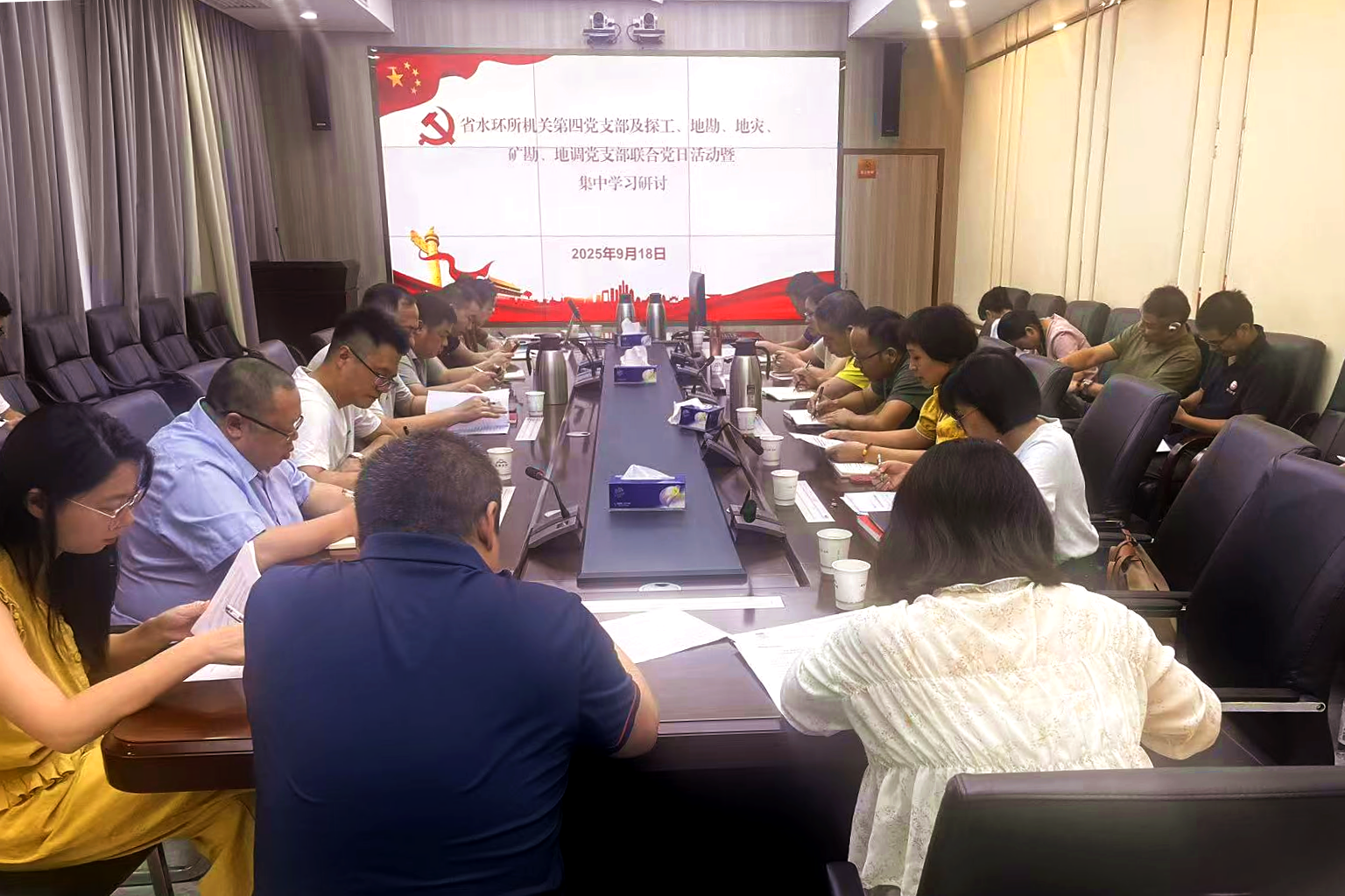 9月18日,省地质院水环所机关第四党支部联合探工、地调、地勘、地灾、矿勘党支部,开展“业财融合、协同发展”主题党日活动,推动党业深度融合,破解协同难题,所党委书记韩冰出席会议。 会议集中学习了中共中央政治局8月29日会议精神、习近平对甘肃兰州市榆中县山洪灾害作出重要指示、习近平作出重要指示强调锲而不舍落实中... .....