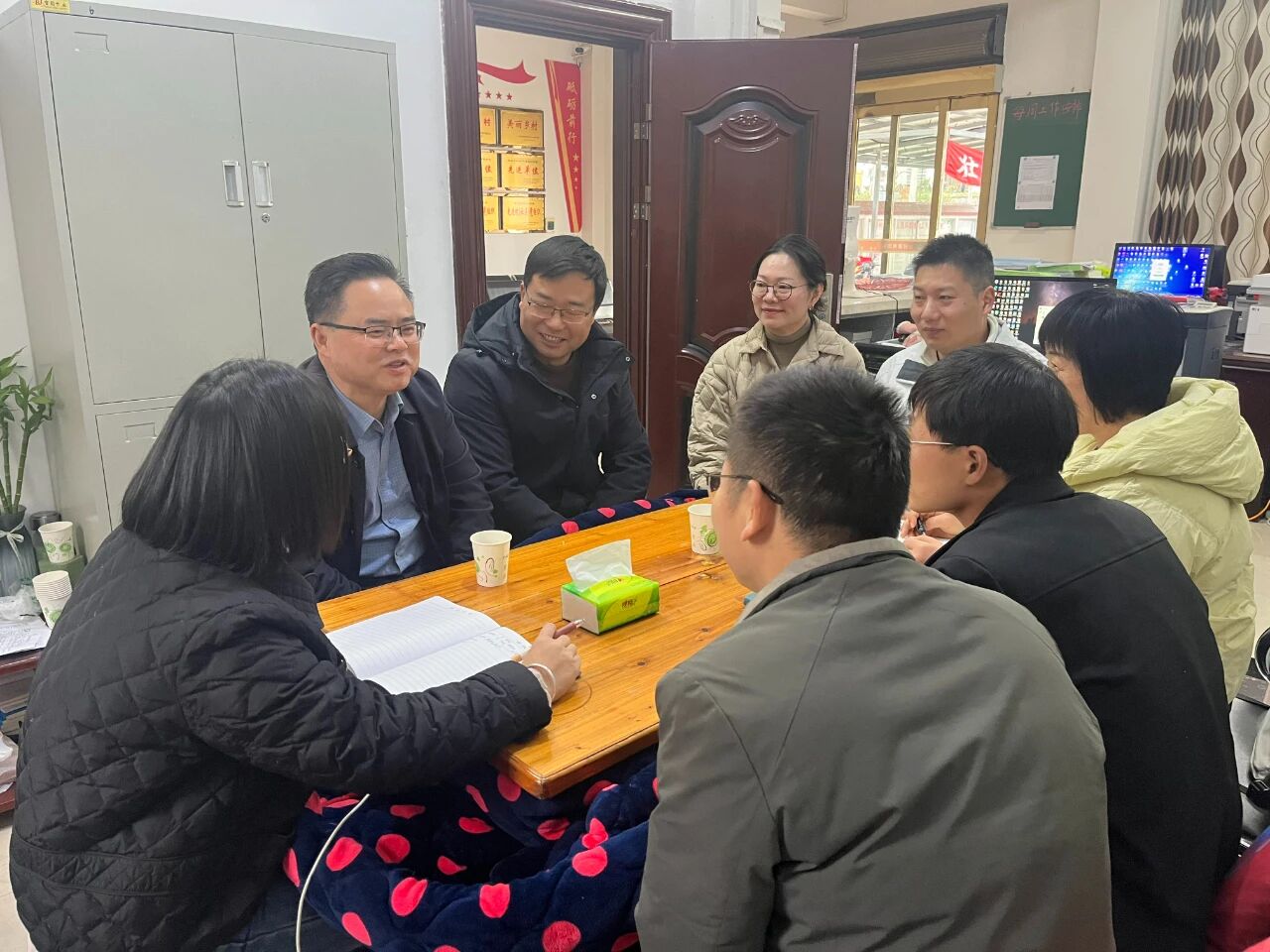 走访伊始,刘定勇与谭村村村委班子、省地质院驻谭村村乡村振兴工作队开展座谈。刘定勇详细了解了谭村村的村情村风和帮扶对象的家庭人口、收入来源、健康状况等基本情况,重点了解了帮扶对象的住房安全、医疗保障、下一代就学等方面的实际困难,并认真记录帮扶需求与诉求,共同探讨针对性帮扶举措。