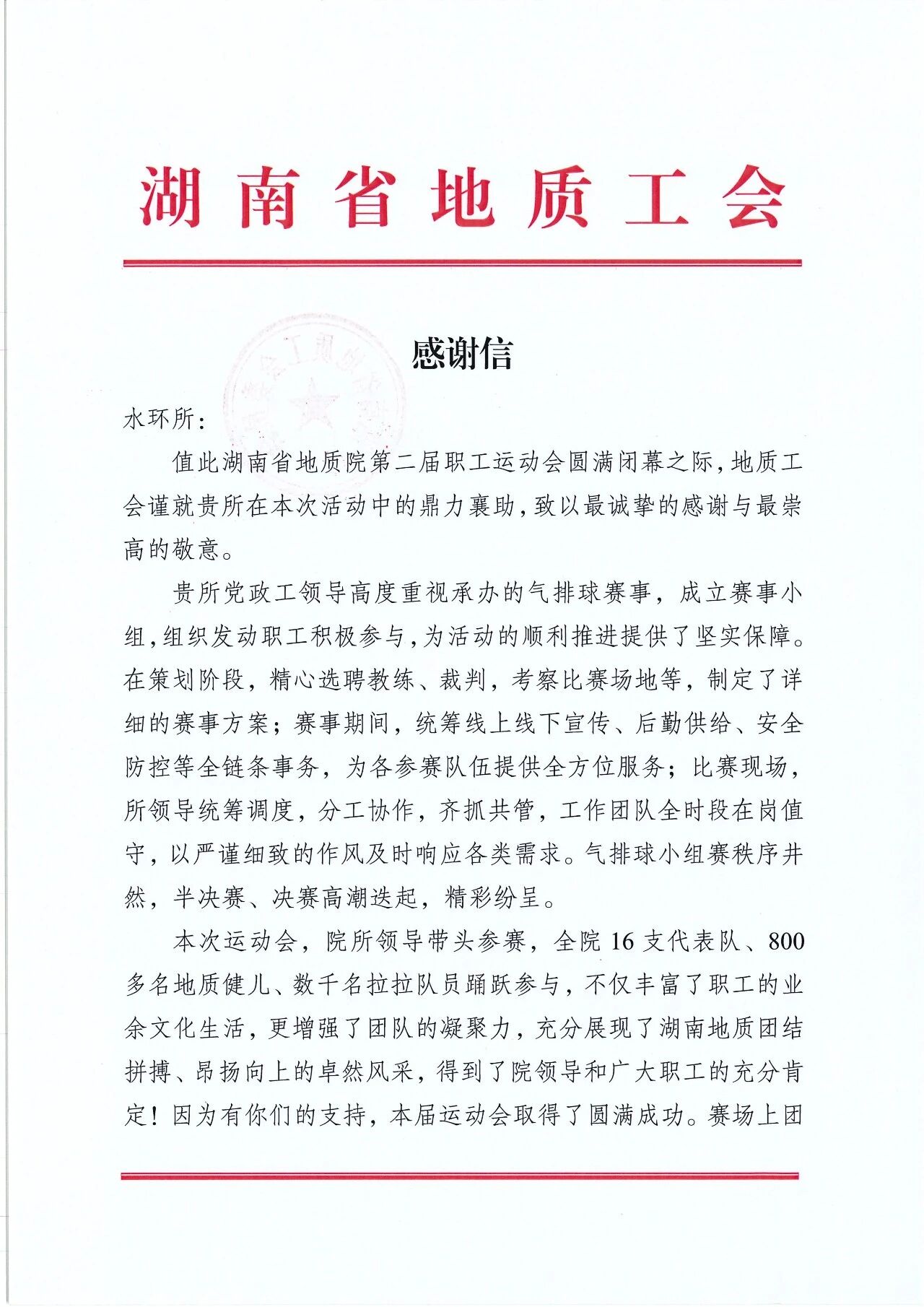 省地质院水环所收到地质工会的感谢信