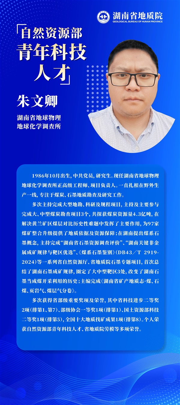 物化所坚持人才是第一资源,深入实施人才强所战略,做深做实人才“引育用聚”四篇文章,支持青年科技人才挑大梁、当主角,以创新平台、重大项目和重大工程为依托,培养了一批优秀的领军人才和科技人才,释放了创新创造活力,为物化事业高质量发展提供了人才支撑。今天推出科技人才篇(二):自然资源部青年科技人才——朱文卿