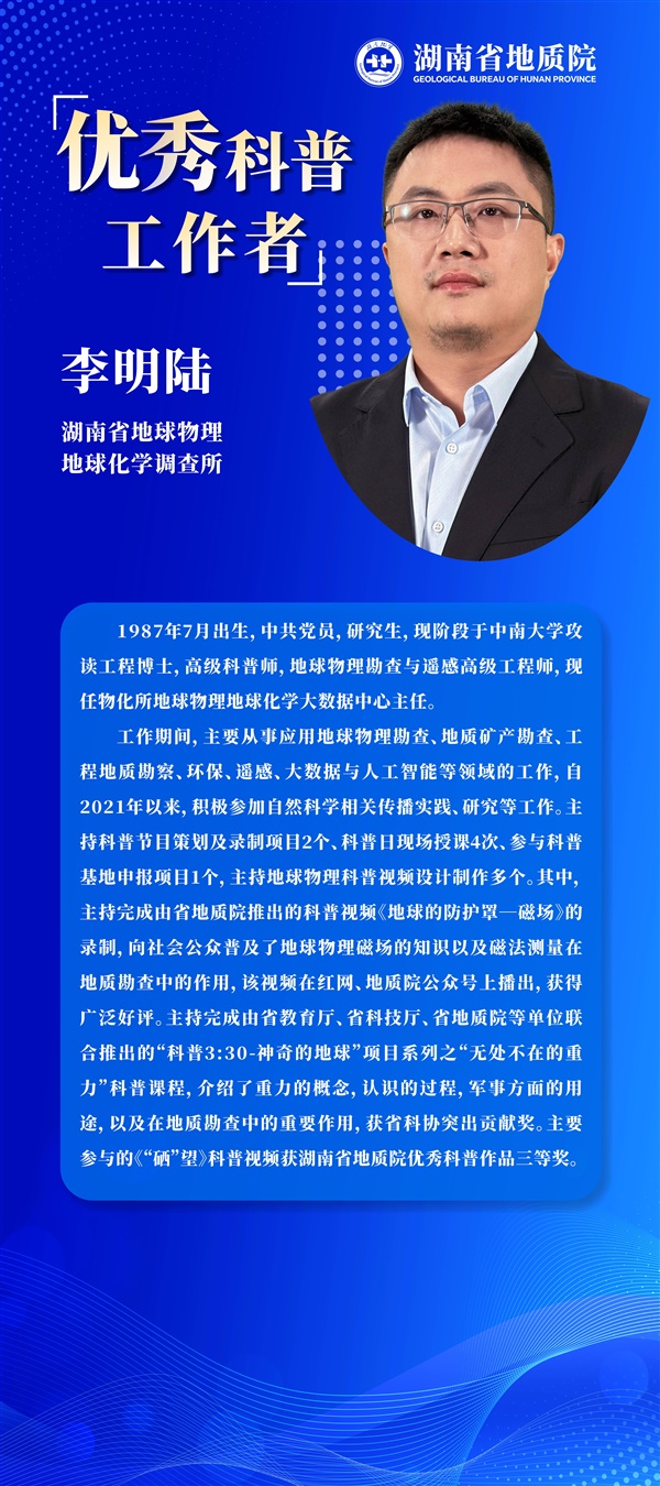 物化所坚持人才是第一资源,深入实施人才强所战略,做深做实人才“引育用聚”四篇文章,支持青年科技人才挑大梁、当主角,以创新平台、重大项目和重大工程为依托,培养了一批优秀的领军人才和科技人才,释放了创新创造活力,为物化事业高质量发展提供了人才支撑。今天推出科技人才篇(五):湖南省地质院优秀科普工作者——李明陆