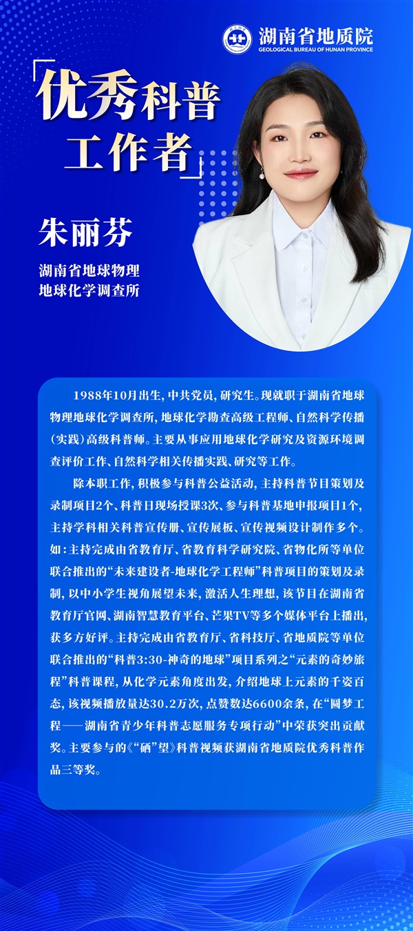 物化所坚持人才是第一资源,深入实施人才强所战略,做深做实人才“引育用聚”四篇文章,支持青年科技人才挑大梁、当主角,以创新平台、重大项目和重大工程为依托,培养了一批优秀的领军人才和科技人才,释放了创新创造活力,为物化事业高质量发展提供了人才支撑。今天推出科技人才篇(六):湖南省地质院优秀科普工作者——朱丽芬