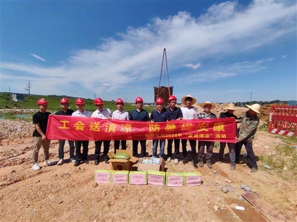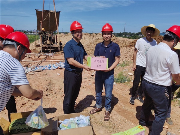 时值高温酷暑,省物化所“工会送清凉、防暑保安康”活动正在进行中。7月17日,所党委书记雷建斌,副所长、工会主席王粒共,所领导罗琼一行走进湘江新区白庭路靳江河大桥岩溶探测项目现场开展送清凉活动,看望慰问在高温酷暑下坚守岗位的一线职工,并送上组织的关怀和夏日的清凉。
