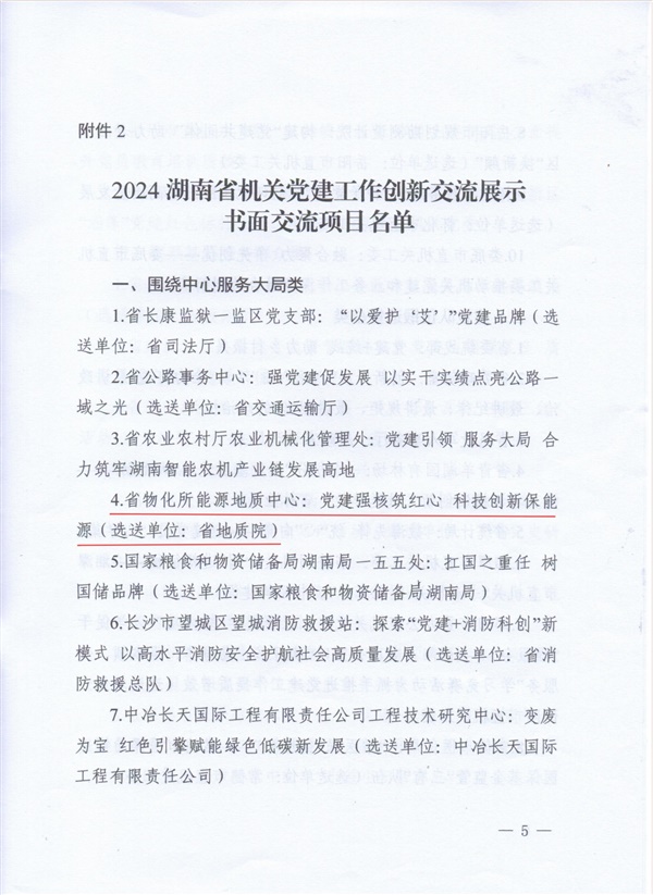近日,由中共湖南省直属机关工作委员会、湖南省机关党建暨思想政治工作研究会联合主办的2024湖南省机关党建工作创新交流展示会现场交流展示活动在长沙举行。由省地质院选送的省物化所能源地质中心“党建强核筑红心 科技创新保能源”党建项目,在全省146个党建项目中脱颖而出,荣获2024年湖南省机关党建工作创新交流展示优秀项目,为湖南省地质院系统唯一。