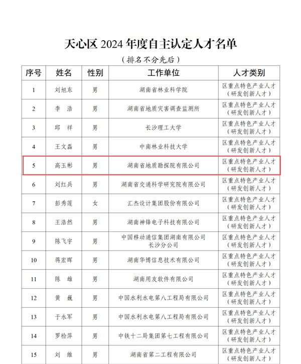 人才成就事业,事业造就人才。高玉彬获此荣誉,不仅是对其科研创新水平的高度认可,也是对省物化所科技创新能力、服务区域经济发展担当的肯定。这将激励省物化所以科技创新需求为牵引,提升地质人才自主培养水平,持续追求卓越、勇于创新,为天心区乃至全省的科技进步与产业发展贡献力量。