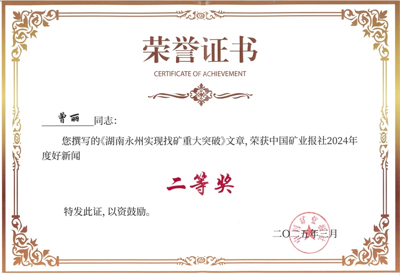 近日,中国矿业报社公布2024年度驻地方机构(个人)好新闻评选结果,省物化所曾丽同志采写的通讯《湖南永州实现重大找矿突破》荣获二等奖,成为省地质院系统在本届评选中唯一获此殊荣的作品。