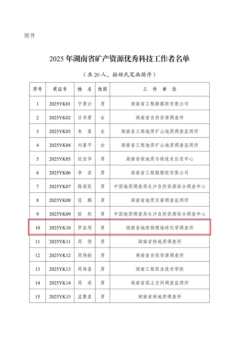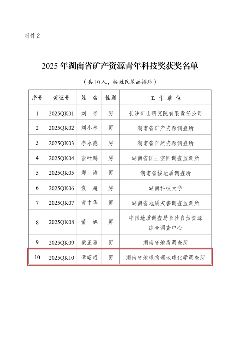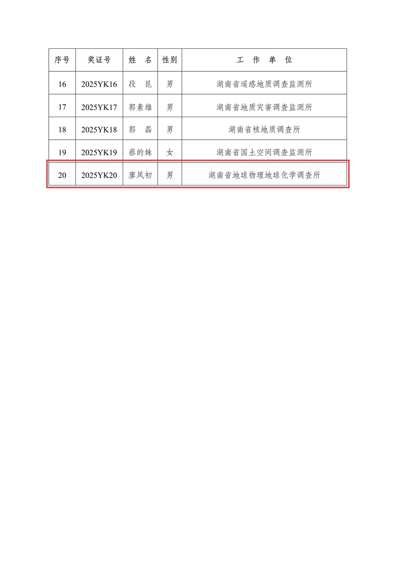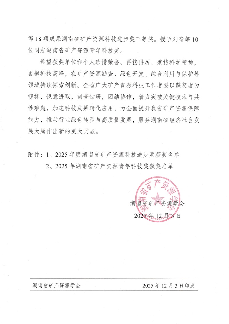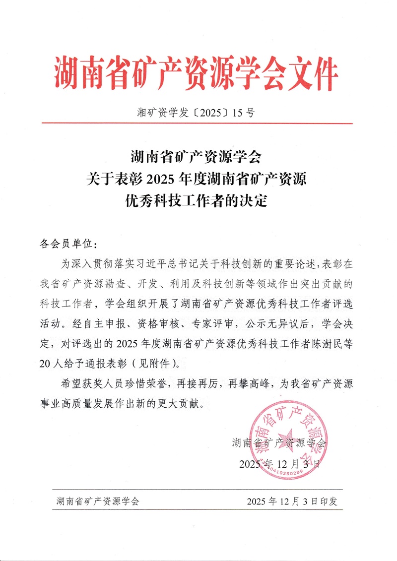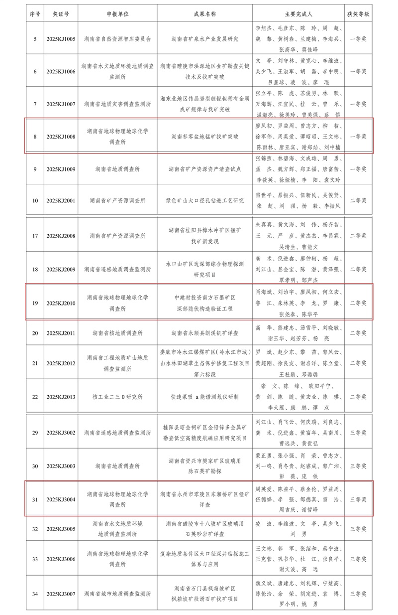 在近日揭晓的湖南省矿产资源学会2025年度科学技术奖及优秀个人评选结果中,省地质院物化所共有四个项目、三位科技工作者获表彰。其中,“湖南祁零盆地锰矿找矿突破”项目获科学技术奖一等奖,“中建材投资南方石墨矿区深部隐伏构造验证工程”获二等奖,“湖南省永州市零陵区东湘桥矿段锰矿详查”和“复杂地质条件区大口径深井钻探施工体系与应用”项目同获三等奖。廖凤初、罗益周获评“优秀科技工作者”,谭昭昭获评“青年科技工作者”。
