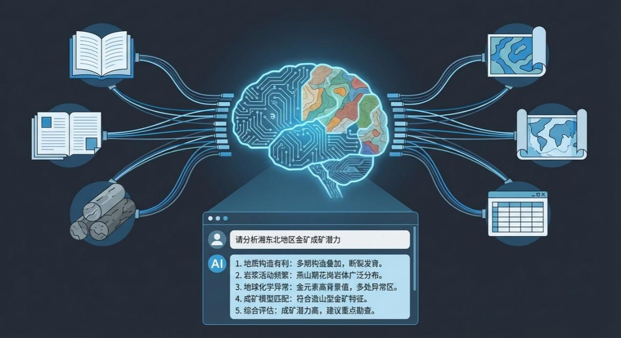 我所在的大数据中心,保管着单位数十年来积累的“数据宝藏”——包括各类勘探报告、地质图件、钻孔数据、物化探数据等。过去,这些知识大多以静态档案的形式沉睡。如今,我们正基于DeepSeek等大模型技术,构建单位的“专属地质智慧大脑”。这个“大脑”的核心是一个经过高质量地质资料训练的专业模型,它具备强大的语义理解和知识问答能力。任何技术人员都可以通过自然语言,像咨询一位资深总工一样,快速查询:“湘中某地区锑矿的成矿规律是什么?”“请帮我找出所有关于某断裂带的地球化学异常报告。”系统不仅能精准定位文档,更能归纳、总结甚至关联不同资料中的知识,生成综合性的分析简报。这彻底打破了资料检索的壁垒,让沉淀的知识流动起来,赋能每一位一线工程师,实现了集体经验与智慧的代际传承与即时共享。这不仅是技术上的升级,更是组织知识管理模式的革命,它将我们单位从一个“数据仓库”转变为一个持续学习、动态进化的“智慧生命体”。
