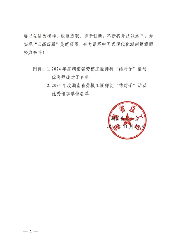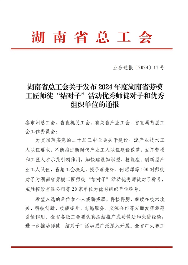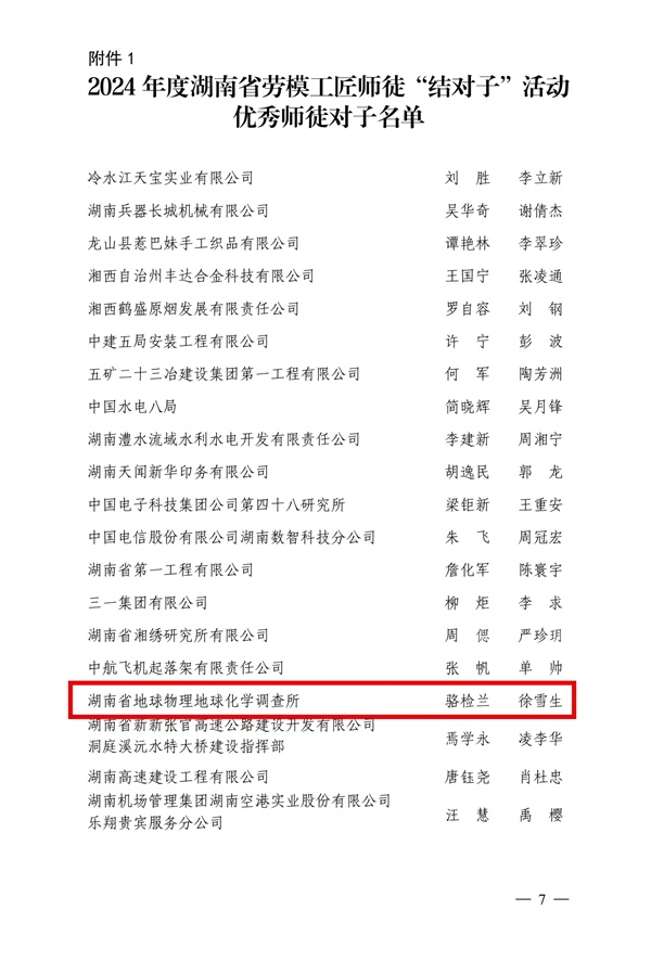 近日,湖南省总工会发布了2024年度湖南省劳模工匠师徒“结对子”活动优秀师徒对子和优秀组织单位的通报,省物化所师徒骆检兰、徐雪生被授予2024年度湖南省劳模工匠师徒“结对子”活动优秀师徒对子称号。