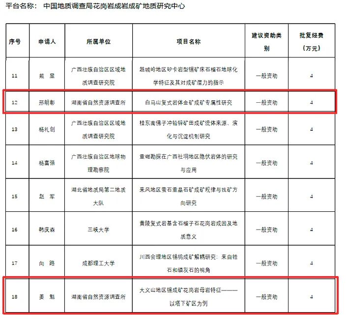 此次入选的课题分别是“湘中隆回县二叠系含锰地层对比、沉积环境分析及古气候研究”、“白马山复式岩体金矿成矿专属性研究”和“大义山地区锡成矿花岗岩母岩特征——以塔下矿区为例”等,资源所首次申报该类型项目即大获丰收,也成为本年度省地质院下属单位申报该开放基金项目立项成功最多的单位,立项结果充分展示了资源所在区域地质科技、资源调查与技术创新方面的综合实力和持续贡献,也体现了资源所在战略性矿产与能源资源调查领域的科研潜力和创新能力,相关项目的实施将进一步增强科研攻关水平,提升原创性成果的产出能力。