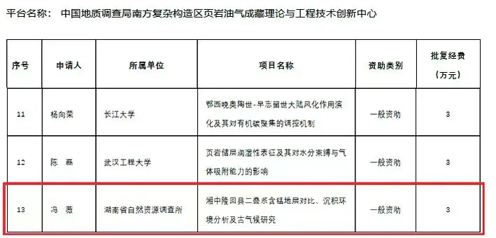近日,中南地质科技创新中心2025年度开放基金拟立项项目完成公示,湖南地质资源所申报的3个课题成功入选,研究方向涵盖页岩油气成藏研究及花岗岩成岩成矿作用研究两大领域。